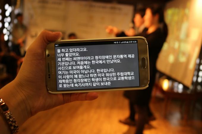 문자통역 서비스는 청각장애인이 취업 및 직무 환경에서 의사소통이 필요할 경우 카카오톡을 이용하여 요청하면 문자통역사(속기사)를 파견, 현장의 소리를 문서 작성 도구를 통해 실시간 글로 제공하는 사업이다.