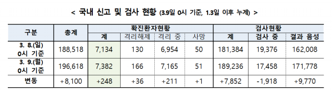 중앙방역대책본부는 9일 0시 기준 코로나19 확진자가 전날 0시에 비해 248명이 증가했다고 밝혔다.
