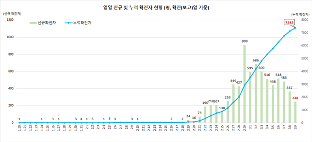 9일 새벽 대구서 확진자 2명 추가로 숨져 사망자는 총 53명 '코로나19' 국내 확진자가 하루새 248명 늘면서 누적 확진자는 총 7382명으로 집계됐다.
