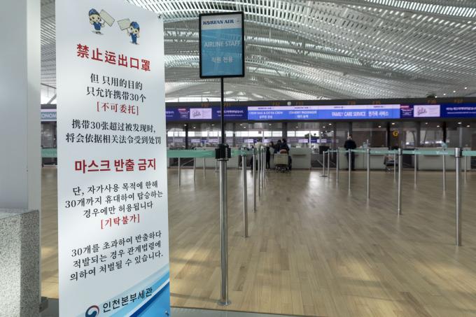 ▲ 한·일 양국이 코로나19 확산 방지를 위해 입국 제한 강화조치를 시행한 9일 오전 인천국제공항 제2여객터미널 내 대한항공 카운터가 한산하다.[문재원 기자]