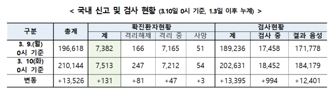 중앙방역대책본부는 10일 0시 기준 코로나19 확진자가 전날 9일 0시에 비해 131명이 증가했다고 밝혔다. 하루 신규 확진자 수가 100명대로 떨어진 건 지난달 25일 이후 2주 만이다.