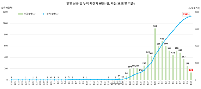 '구로 콜센터' 집단 감염으로 수도권 신규 확진자 26명 증가 '코로나19' 국내 확진 환자가 하루동안 131명 늘어 누적 확진자 수는 총 7513명으로 집계됐다. 특히 대구지역의 일일 추가 확진자 수는 100명 아래로 떨어졌다.