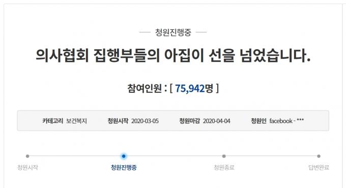 "전문성 살릴 정상적인 집행부 꾸리자" 의사협회 집행부를 강하게 성토하는 청와대 국민청원의 동의 수가 게시 후 5일 만인 10일 오후 3시 33분 기준 7만6000명에 육박하고 있다.