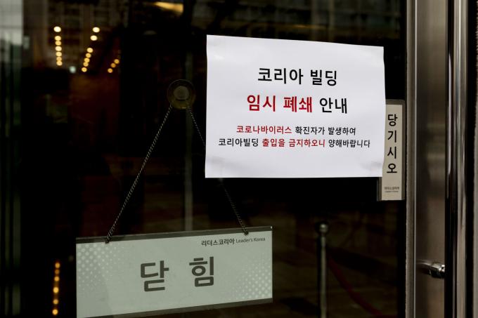 ▲ 10일 오후 서울 구로구 코리아빌딩에 위치한 에이스손해보험 콜센터에서 코로나19 집단 감염 확진자가 무더기로 발생한 가운데 해당 건물 입구에 임시 폐쇄 안내문이 붙어 있다. [문재원 기자]
