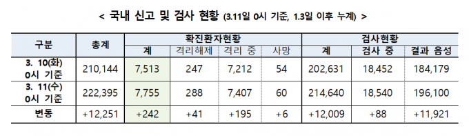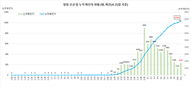 사망자 총 61명…격리 해제된 확진자는 41명 추가돼 288명 '코로나19' 국내 확진 환자가 하루새 242명 늘면서 누적 확진자 수는 총 7755명으로 집계됐다. 특히 콜센터 집단감염 사례가 확인된 서울지역에서만 52명의 확진 환자가 추가로 확인됐다.