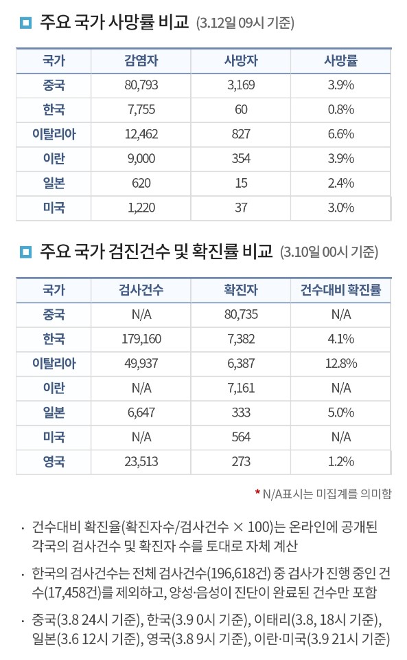12일 9시 기준 주요국가의 사망률은 이탈리아 6.6%, 중국 3.9%, 이란 3.9%, 미국 3.0%, 일본 2.4%, 스페인 2.4%, 프랑스 2.1%다. 타 주요 국가의 사망률과 비교했을 때 한국의 사망률이 현저히 낮음을 알 수 있다.