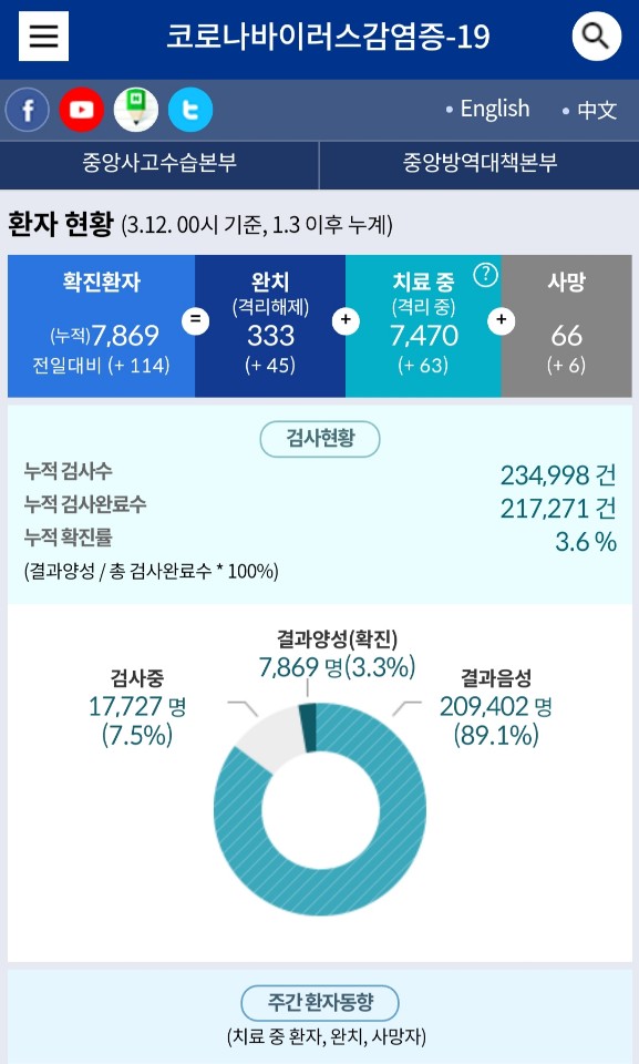 한국의 코로나19 사망률은 12일 0시 기준 0.84%다. 7869명의 확진환자 중 66명의 사망자가 나왔다.