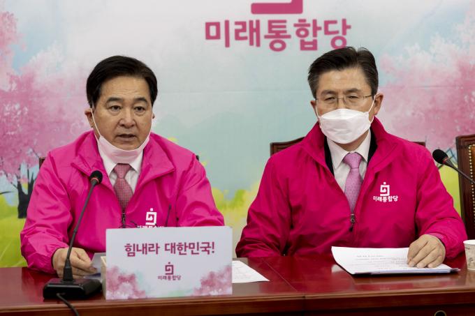 미래통합당 심재철 원내대표(왼쪽)가 12일 오전 서울 여의도 국회에서 열린 당 최고위원회의에 참석해 발언하고 있다.