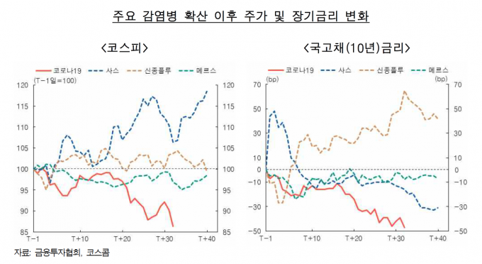이는 코로나19의 세계보건기구(WHO) 최초 상황 보고 발표일인 지난 1월 21일을 기준으로 다른 유행 감염병과 국내 금융시장의 단기 반응을 비교한 결과다.