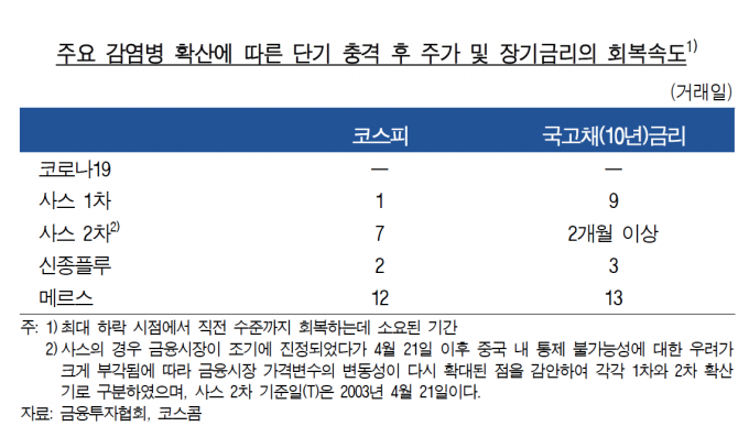 금융시장의 회복도 과거 사례에 비해 더딘 것으로 나타났다. 과거 감염병 확산 시에는 금융시장 가격변수들이 사스 당시의 장기금리를 제외하면 충격 발생 후 13거래일 이내에 직전 수준을 회복했나, 이번 코로나19 확산 이후에는 주가와 장기금리 모두 3월 들어서도 직전 수준을 크게 하회하고 있다.