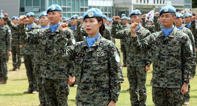 ▲지난해 7월 8일 인천 계양구 국제평화지원단에서 열린 남수단재건지원단(한빛부대) 11진 환송식에서 파병장병들이 결의를 다지고 있다. [뉴시스]