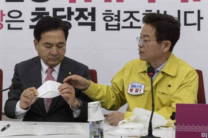 미래통합당 심재철 원내대표가 12일 오후 서울 여의도 국회에서 이철우 경북도지사에게 경북도 공무원들이 제작한 마스크 필터에 대해 설명을 듣고 있다.