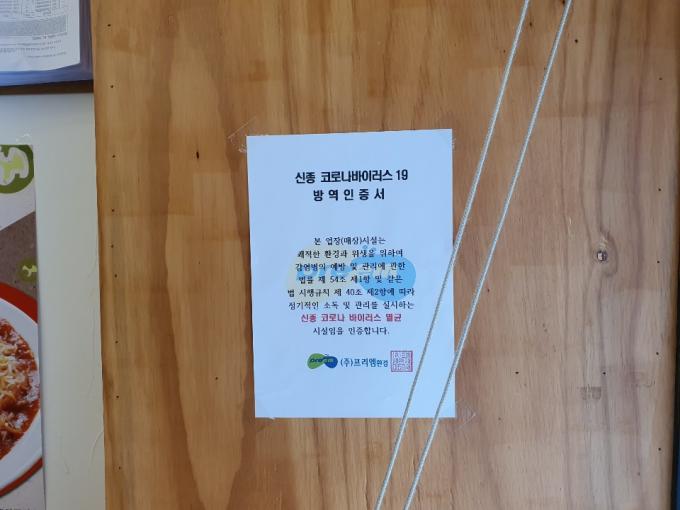 ▲ 코로나19 확진자가 다녀간 동대문구의 한 식당이 코로나19 방역인증서를 벽에 붙여놨다. [김형환 인턴기자]