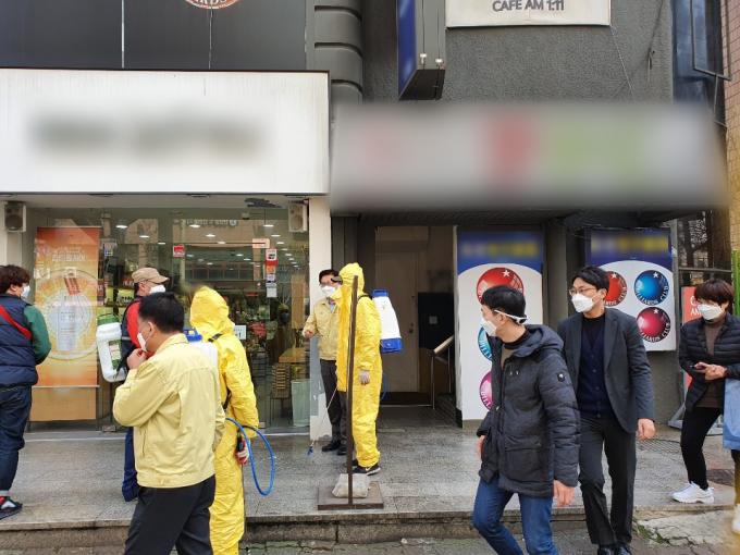 ▲ 12일 낮 동대문구청장과 방역 관계자가 확진자가 발생한 PC방 건물을 방역 작업하고 있다. [김형환 인턴기자]