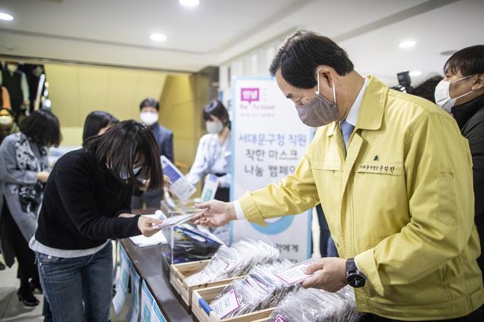 ▲ 서울시가 25개 자치구 모든 임신부 약4만 명에게 1인당 5매씩 총 20만 매의 마스크를 지급한다고 13일 밝혔다. 사진은 마스크 지급문석진 서대문구청장이 13일 서울 서대문구청에서 열린 '착한 마스크 나눔 캠페인'에서 보건용 마스크를 기부한 직원들에게 천 마스크를 전달하고 있는 모습. [정병혁 기자]