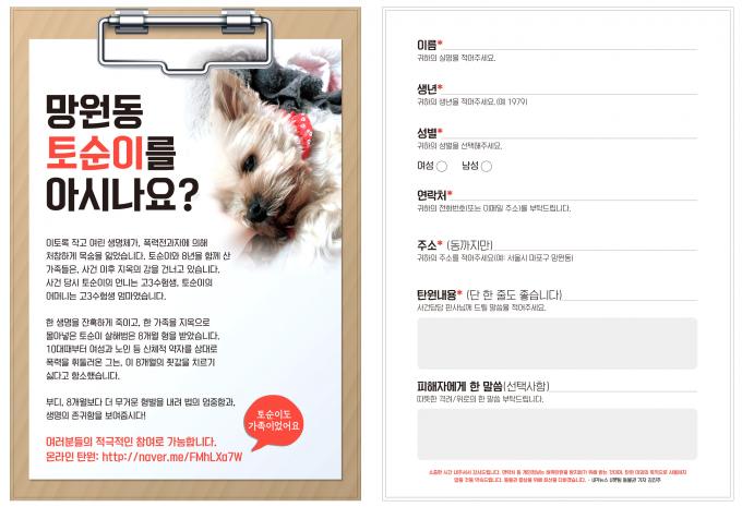 한편 토순이 사건은 온라인 탄원이 진행 중이다. 13일 기준 4700여 명이 참여해 토순이 살해범에 대한 엄중처벌 및 동물보호법 강화를 호소했다. 또 A 씨는 지인의 도움을 받아 토순이 사건을 알리는 전단을 제작, 망원역과 합정역 부근에 배포하고 있다.