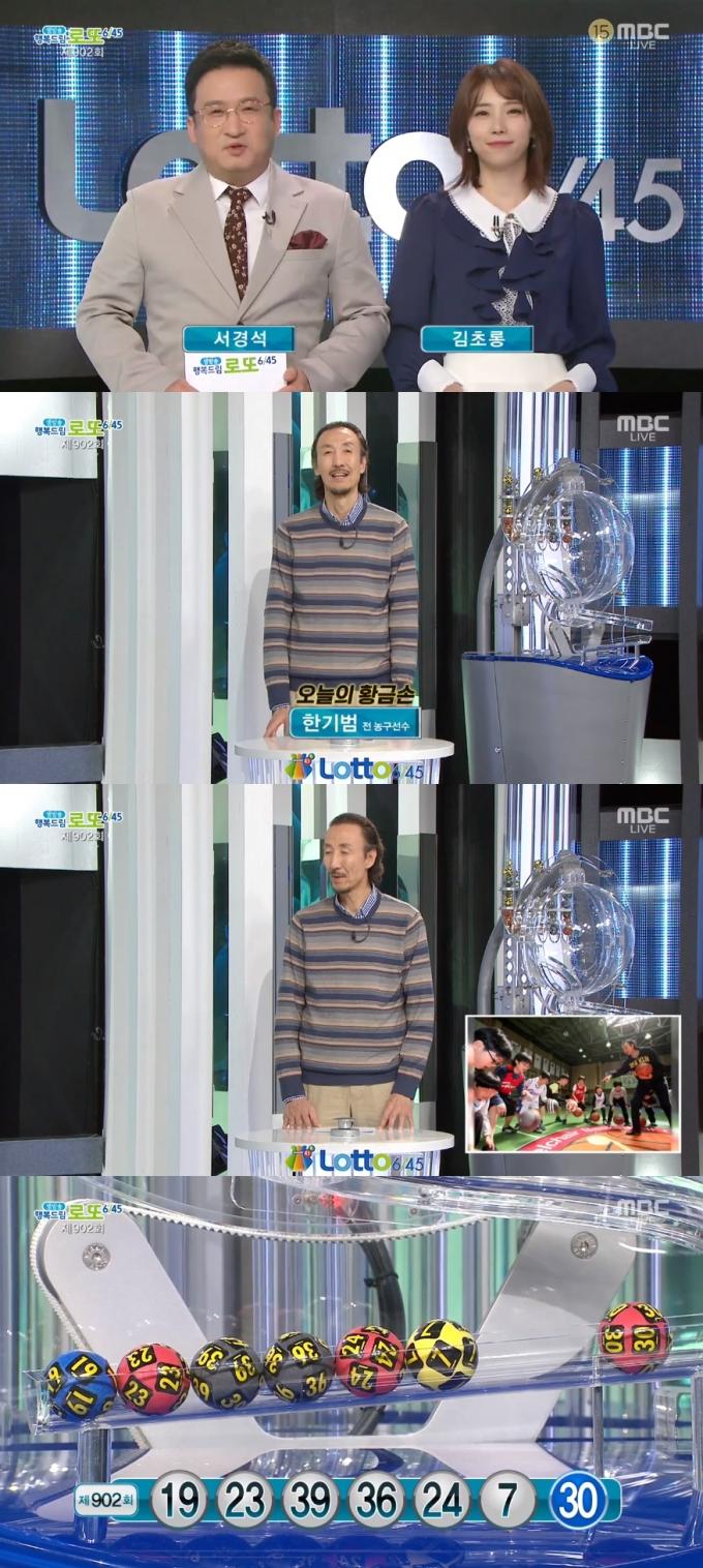 14일 방송된 MBC '생방송 행복드림 로또 6/45'에서는 제902회 로또복권 당첨번호 추첨이 진행됐다. 이날 방송에는 전 농구선수 한기범이 황금손으로 출연해 복권 추첨 버튼을 눌렀다.