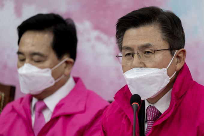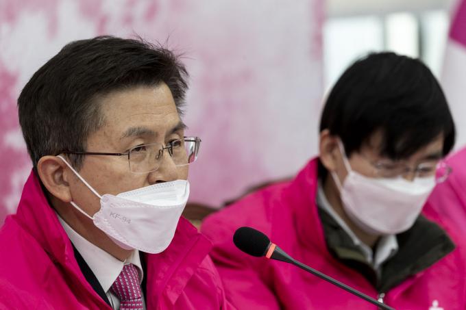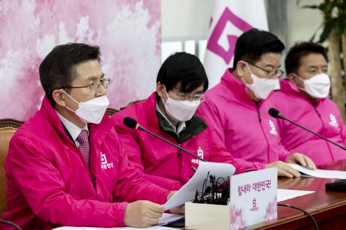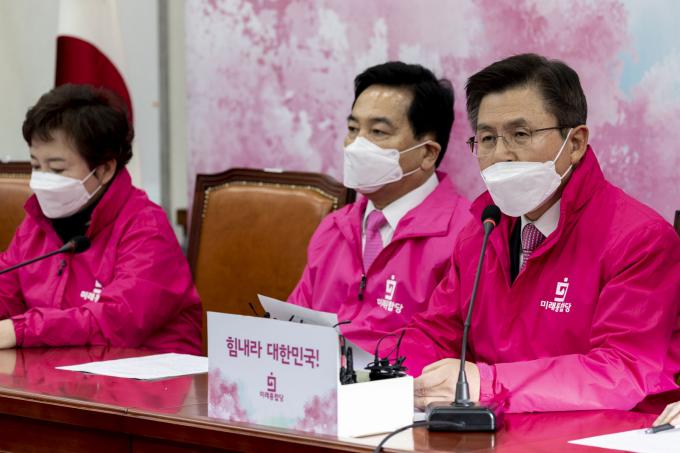 미래통합당 황교안 대표(왼쪽)가 16일 오전 서울 여의도 국회 당 대회의실에서 열린 최고위원회의에 참석해 발언하고 있다.