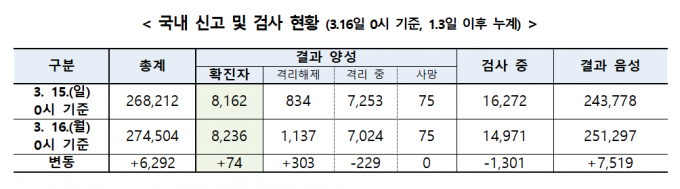 중앙방역대책본부는 16일 0시 기준 코로나19 확진자가 전날 0시보다 74명 증가했다고 밝혔다.