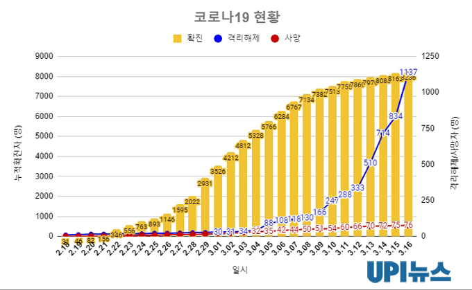 경북서 사망자 1명 늘어 76명…격리 해제 303명 추가돼 총 1137명 '코로나19' 국내 확진 환자가 하루동안 74명 추가돼 누적 확진자는 총 8236명이 됐다. 특히 신규 확진자는 이틀 연속 두 자릿수에 그친 것으로 나타났다.