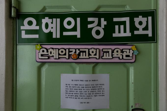 ▲ 16일 오후 '코로나19' 확진자가 집단 발생한 경기 성남시 수정구 '은혜의 강' 교회 입구에 폐쇄 명령서가 붙어 있다. '은혜의 강' 교회 확진자들은 지난 8일 함께 예배를 본 것으로 확인됐다. [문재원 기자]