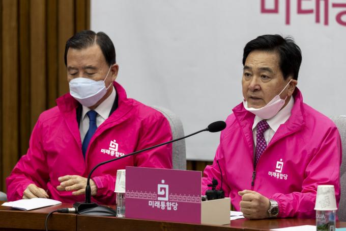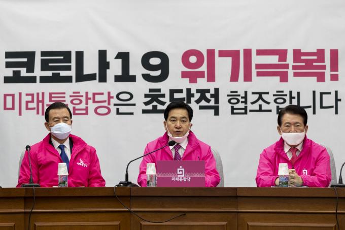 미래통합당 심재철 원내대표(가운데)가 17일 오전 서울 여의도 국회 제3회의장에서 열린 당 원내대책회의에 참석해 발언하고 있다.