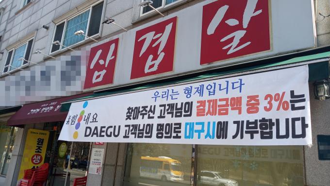 사진은 경기 용인의 한 식당이다. 매출액의 3%를 코로나19로 힘들어하는 대구에 기부하겠다는 커다란 배너가 걸렸다. 이런 마음이 모아지고, 공동체를 먼저 배려하는 공공질서를 지켜가면 코로나19 바이러스는 얌전히 물러날 수밖에 없을 것이다.