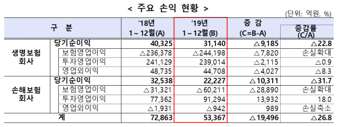 손해보험사의 당기순이익은 2조2227억 원으로 전년도보다 1조311억 원(31.7%) 줄었다. 자동차보험과 실손의료보험 분야에서 손실이 커진 영향이다. 손보사의 보험영업 손실은 6조211억 원으로 전년 대비 손실폭이 2조8890억 원 늘었다.