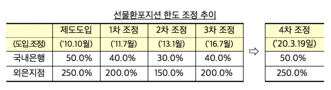국내은행의 선물환 포지션 한도는 40%에서 50%로, 외은지점은 200%에서 250%로 각각 확대된다.