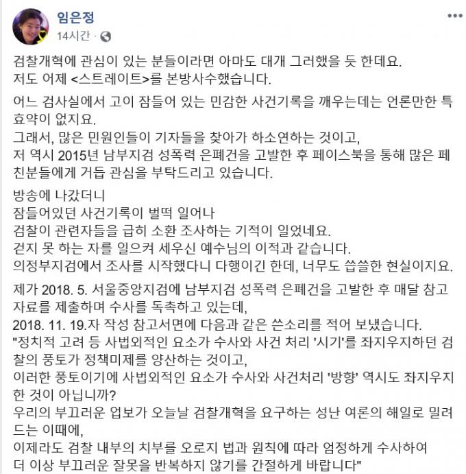임 부장검사는 "저도 MBC '스트레이트'를 본방 사수했다"며 "어느 검사실에 고이 잠들어 있는 민감한 사건 기록을 깨우는 데는 언론만 한 특효약이 없다"고 말했다.