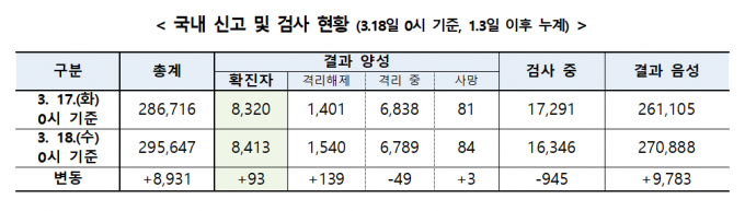 중앙방역대책본부는 18일 0시 기준 코로나19 확진자가 전날 0시보다 93명 증가했다고 밝혔다.
