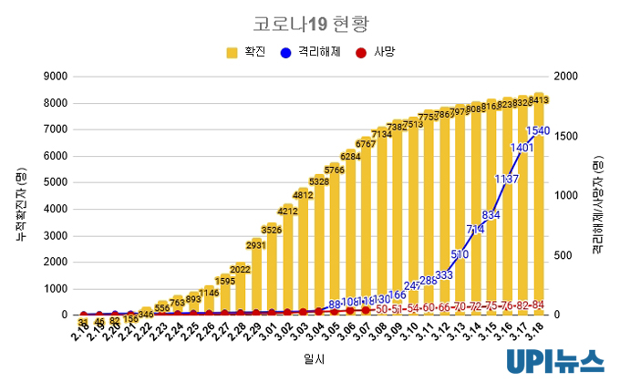 완치 판정을 받고 격리 해제된 사람도 139명 늘어 모두 1540명으로 확인됐다.