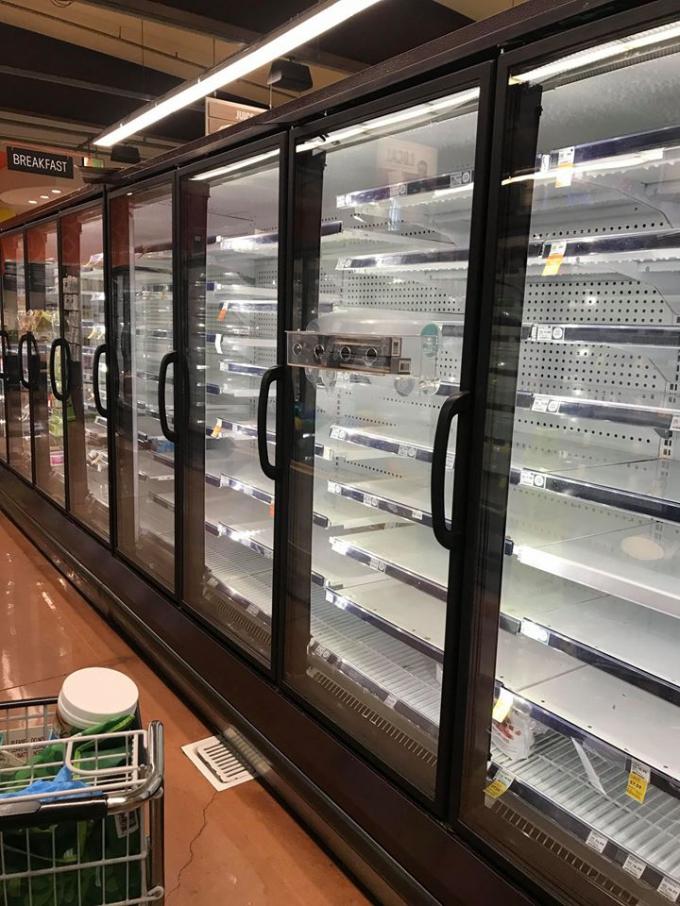 ▲사재기로 텅 비어버린 식품점의 냉동식품 코너. [페이스북 캡처] 이곳은 방역 마스크 같은 건 원래도 시중에서 구할 수 있는 물건이 아니고 인터넷에서 그나마 구할 수 있던 것들은 다 동이 나서 지금 판매가 되는 것으로 보이는 사이트들은 클릭해서 결제하려고 보면 도매로 구입해야 한다는 등, 정상적인 사이트가 아닙니다.