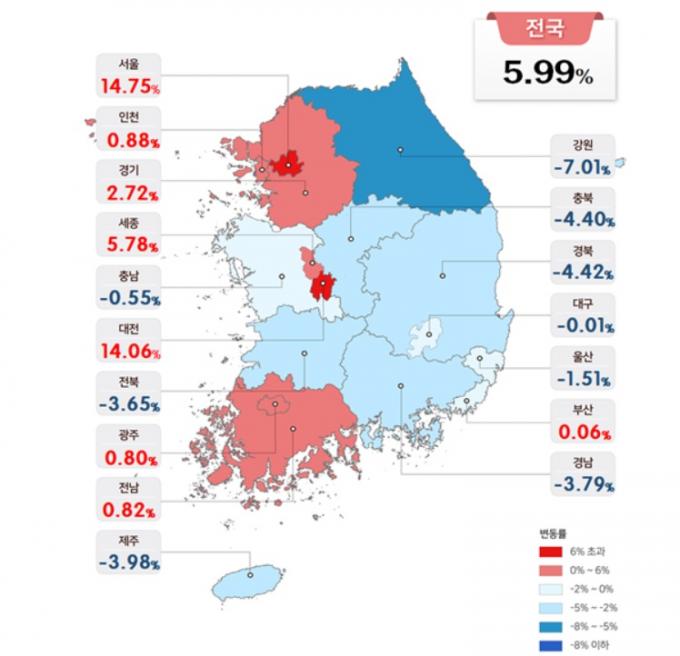 공시가격은 지역별로 편차가 뚜렷했다. 17개 시도 가운데 집값 상승폭이 컸던 서울(14.75%)과 대전(14.06%)은 전국 평균을 두 배 넘게 웃도는 높은 상승률을 보였다. 이어 세종(5.78%), 경기(2.72%) 순이었다.