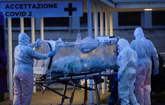 ▲16일(현지시간) 이탈리아 로마의 '코로나19' 전담 병원에서 의료진이 한 환자를 생화학적 봉쇄 처리된 들것에 실어 이동하고 있다. [AP 뉴시스]