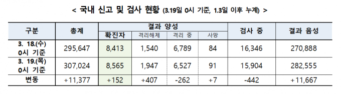 중앙방역대책본부는 19일 0시 기준 코로나19 확진자가 전날 0시보다 152명 증가했다고 밝혔다.