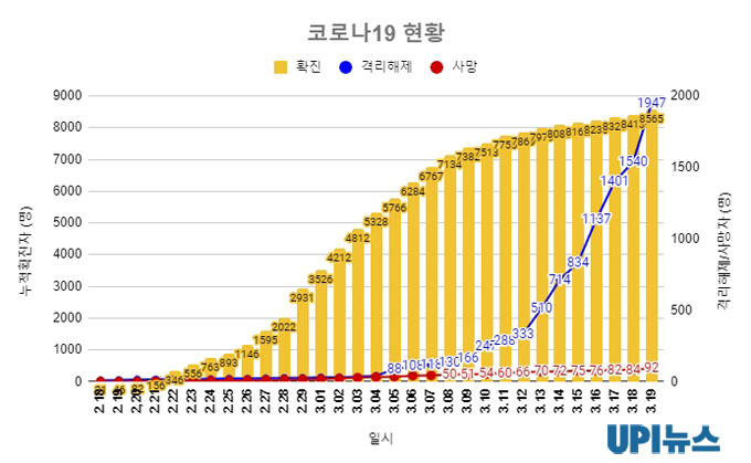 이와 함께 지금까지 국내에서 확인된 사망자는 총 92명이다. 공식 집계로는 전날보다 7명(85~91번째)이 추가됐지만, 경북에서 1명(92번째)이 더 확인됐다. 치명률은 사망자 92명을 기준으로 1.07%다.