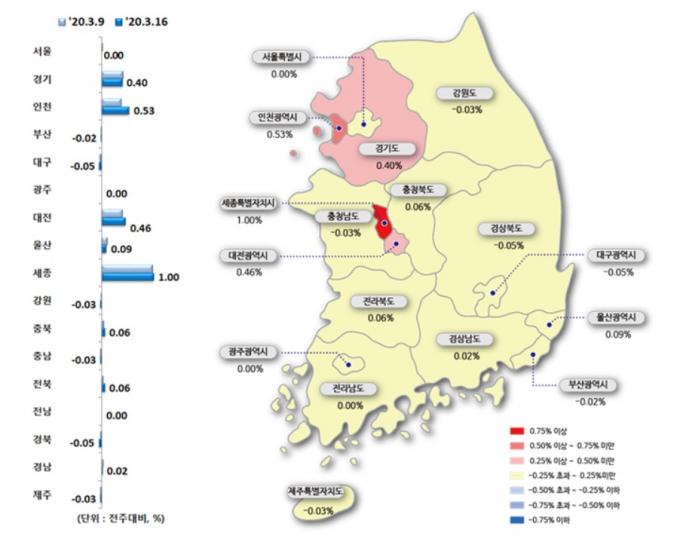 대전(0.46%)과 세종(1.00%)의 과열 양상도 계속되고 있다. 세종은 인구유입·입주물량 감소 영향이 지속하는 상황에서 정부청사 인근이나 상대적으로 저평가된 단지 수요, 대전 출퇴근 수요 등이 집값을 밀어올리고 있다.