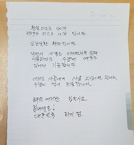 남성은 편지에 "(저는)심장질환 환자입니다"라며 "작년에 미세먼지를 위해 사놓은 마스크를 사용하다가 수량에 여유가 생겨 기증합니다"라고 밝혔다. 그는 "어려운 사람에게 사용되었으면 합니다. 수량이 적어 죄송합니다"며 오히려 미안한 마음을 전했다.