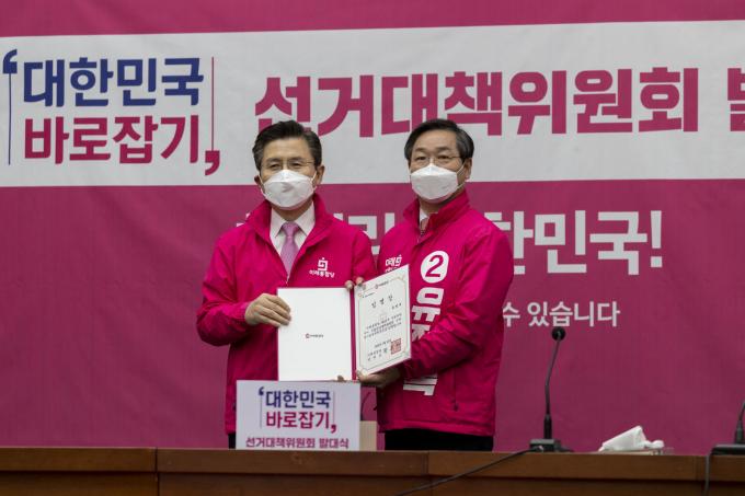 미래통합당 제21대 국회의원선거 중앙선거대책위원회 발대식이 20일 오전 서울 여의도 국회에서 열린 가운데 총괄선거대책위원장을 맡은 황교안 대표(왼쪽)가 인천·경기 권역위원장으로 임명된 유정복 전 인천시장과 기념촬영을 하고 있다.