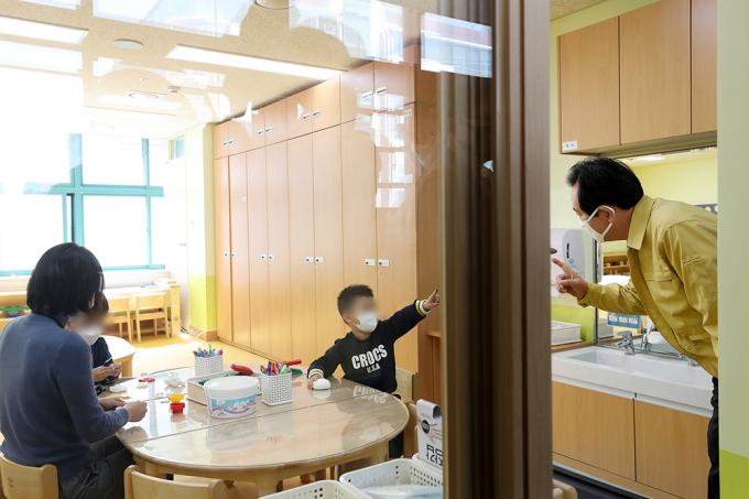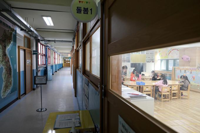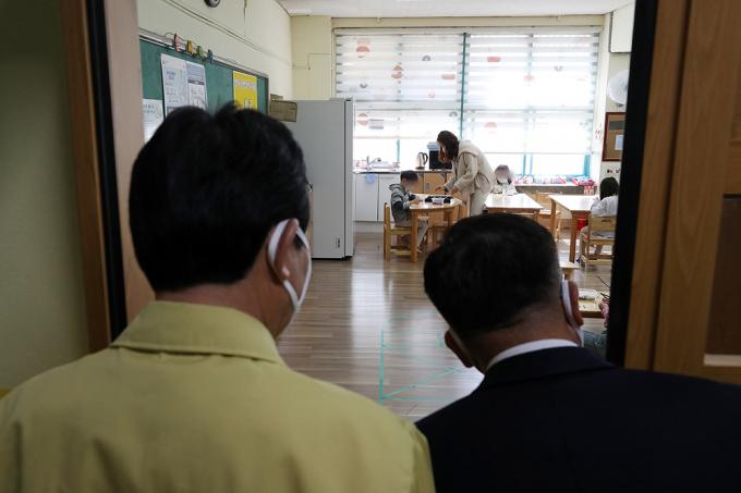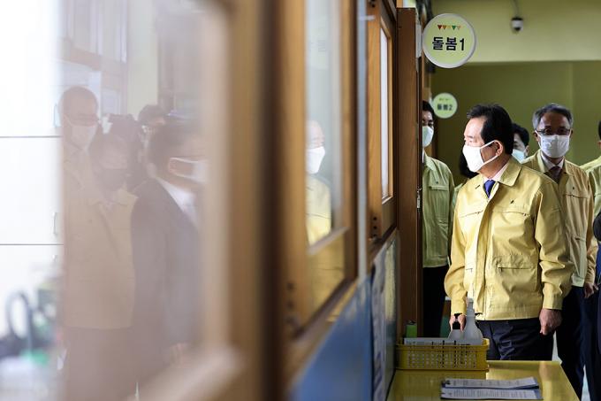 정세균 국무총리가 20일 오전 서울 마포구의 한 초등학교에 마련된 돌봄교실을 살펴보고 있다.
