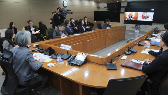 ▲ 20일 오전 강경화 외교부 장관이 서울 종로구 외교부 종합상황실에서 왕이(王毅) 중국 외교부장, 모테기 도시미쓰 일본 외무상과 코로나19 대응 화상회의하고 있다. [뉴시스]