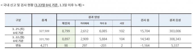 누적 사망자 2명 추가돼 104명…진단 검사자 33만명 돌파 22일 코로나19 국내 확진자 수는 총 8897명으로 집계됐다.