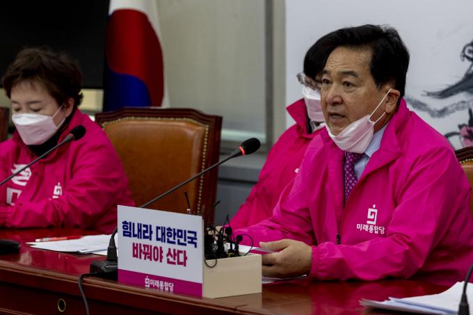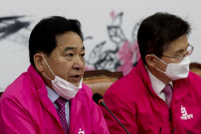 미래통합당 심재철 원내대표(오른쪽)가 23일 오전 서울 여의도 국회에서 열린 당 중앙선거대책위원회 회의에 참석해 발언하고 있다.