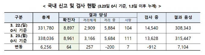 중앙방역대책본부는 23일 0시 기준 코로나19 확진자가 전날 0시보다 64명 증가했다고 밝혔다.