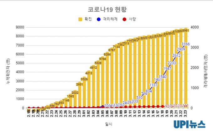 대구경북 26명·경기 14명·검역 13명 증가…해외 유입은 144명 '코로나19' 국내 확진자가 하루동안 64명 늘어나 누적 8961명으로 확인됐다. 특히 이달 들어 가장 적은 폭의 증가세를 보인 것으로 나타났다.