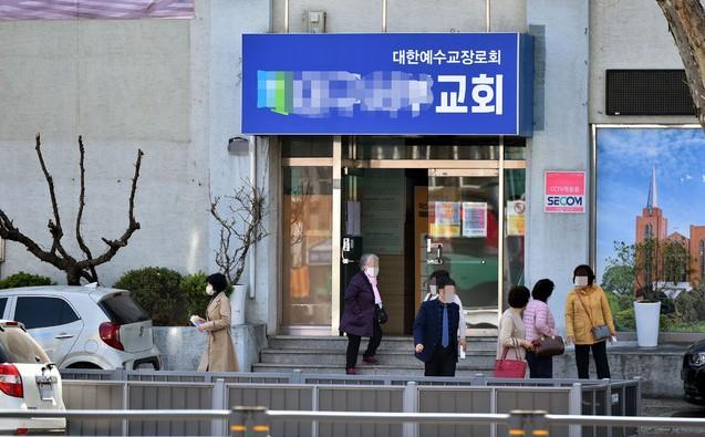 ▲지난 22일 오전 대구의 한 교회에서 예배를 마친 신도들이 교회를 나오고 있다. [뉴시스]