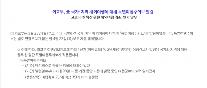 외교부는 "해당 기간 해외여행을 계획한 국민은 여행을 취소하거나 연기해 달라"면서 "해외에 체류 중인 국민은 코로나19 감염 피해에 노출되지 않도록 철저한 위생 수칙 준수와 함께 국내에서 시행하는 수준으로 '사회적 거리두기'를 실천하는 등 신변안전에 특별히 유의해 주시기 바란다"고 당부했다.