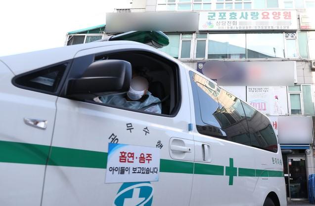 ▲지난 19일 오후 '코로나19' 확진자가 발생해 폐쇄 조치된 경기 군포시 군포효사랑요양원에서 군포시보건소 차량이 빠져나오고 있다. [뉴시스]