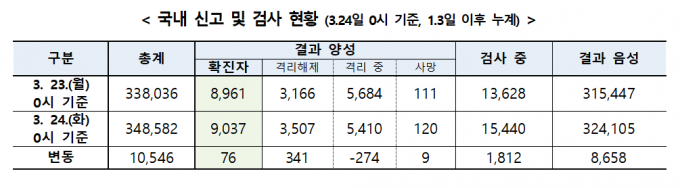 중앙방역대책본부는 24일 0시 기준 코로나19 확진자가 전날 0시보다 76명 증가했다고 밝혔다.